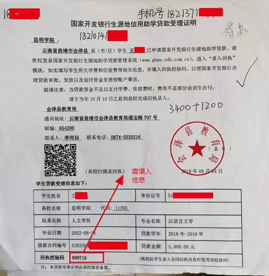 填写贷款金额-->下一步-->填写“国家开发银行生源地信用生源地贷款受理证明”(本图以国家开发银行为例)上的回执校验码并将生源地贷款相关证明材料拍照上传-->提交审核。