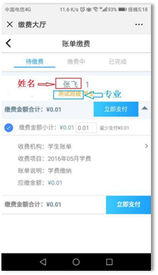 4.登录进入缴费平台后,点击“账单缴费”,请核对姓名、专业信息无误后再进行缴费。也可以点击右下角“我的”查看姓名。